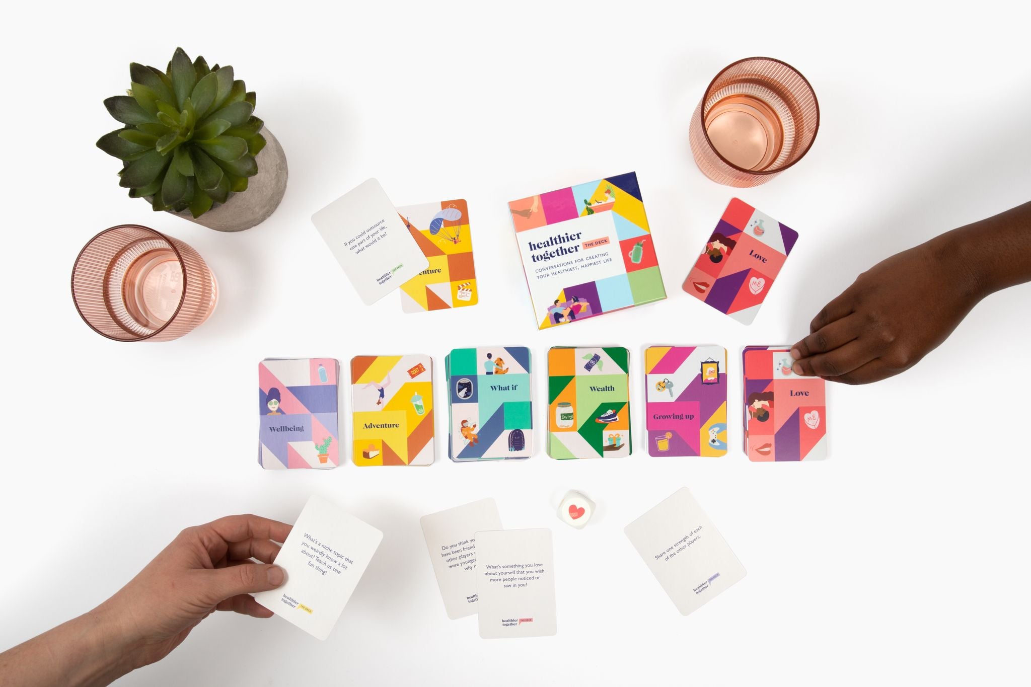 Our flagship conversation starter game, Healthier Together: The Deck, is perfect for anyone who wants to make dinner parties more lively, develop intimacy with their partner, eliminate surface banter on a first date, get to know their parents as real people, take the boredom out of long road trips or connect with new and old friends!